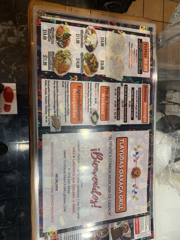 Introducing the menu at Tlayudas Oaxaca Grill, a taco joint located at 3652 W Lawrence Ave in Chicago, offering takeout options. The menu features dishes like the half and whole grill roasted chicken Oaxaca style, chicken value combos, and homemade sides like baked beans and mashed potatoes. Customers rave about the delicious tlayuda, a 14-inch Mexican pizza topped with beans, cabbage, cheese, and various toppings. The vegetarian "mixto" tlayuda with mushrooms and squash blossoms is a standout choice. The crispy, thin tortilla base and generous toppings make for a unique and flavorful dining experience. With affordable prices and generous portion sizes, Tlayudas Oaxaca Grill is a must-visit for Mexican food enthusiasts in the area. Recommended options include the pastor and steak gordita.